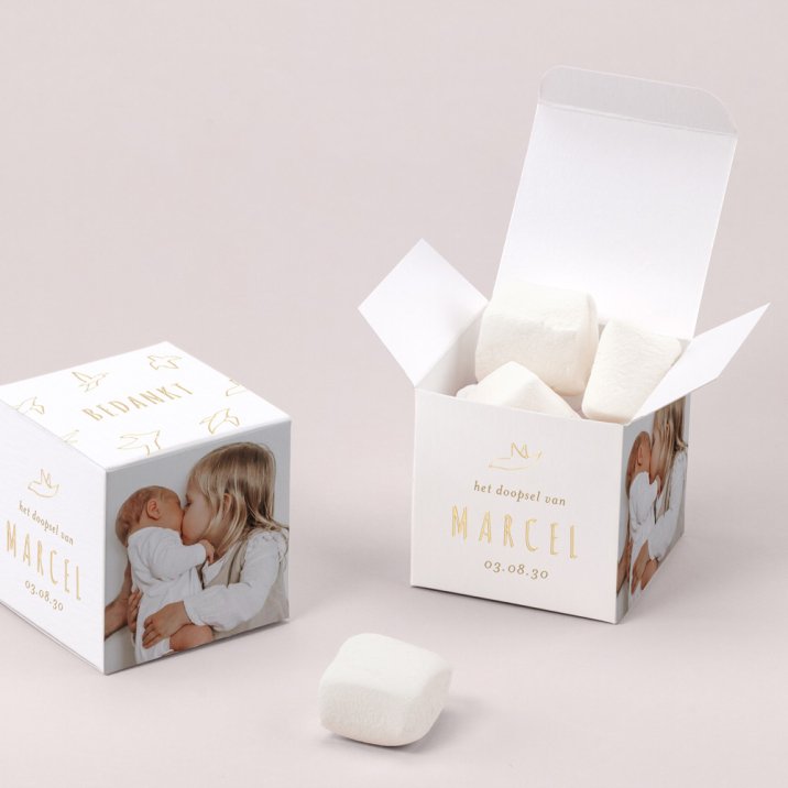 Een verrassingsdoosje als cadeautje voor je familie en vrienden, een mooie herinnering aan het doopfeest van jullie kind. Een kleine kubus van 5,4 x 5,4 cm waarin verschillende soorten lekkernijen kunnen. Laat je creativiteit de vrije loop!