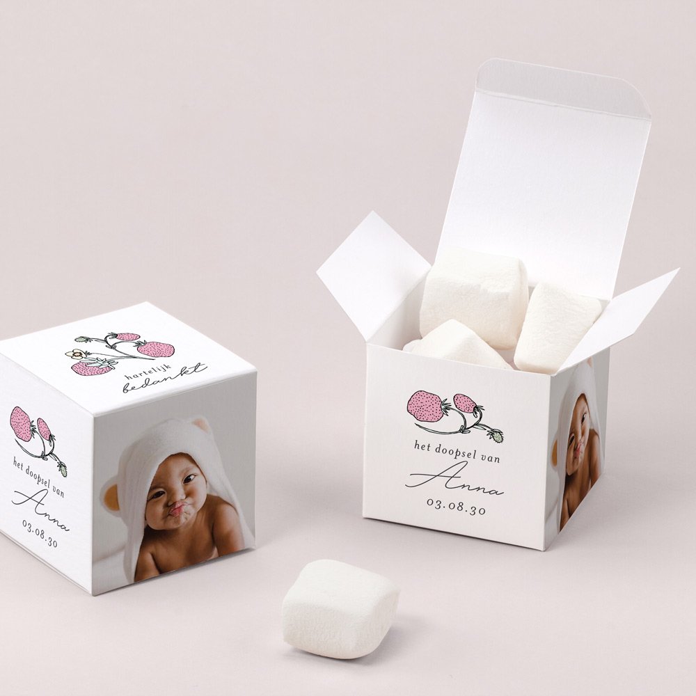 Een verrassingsdoosje als cadeautje voor je familie en vrienden, een mooie herinnering aan het doopfeest van jullie kind. Een kleine kubus van 5,4 x 5,4 cm waarin verschillende soorten lekkernijen kunnen. Laat je creativiteit de vrije loop!