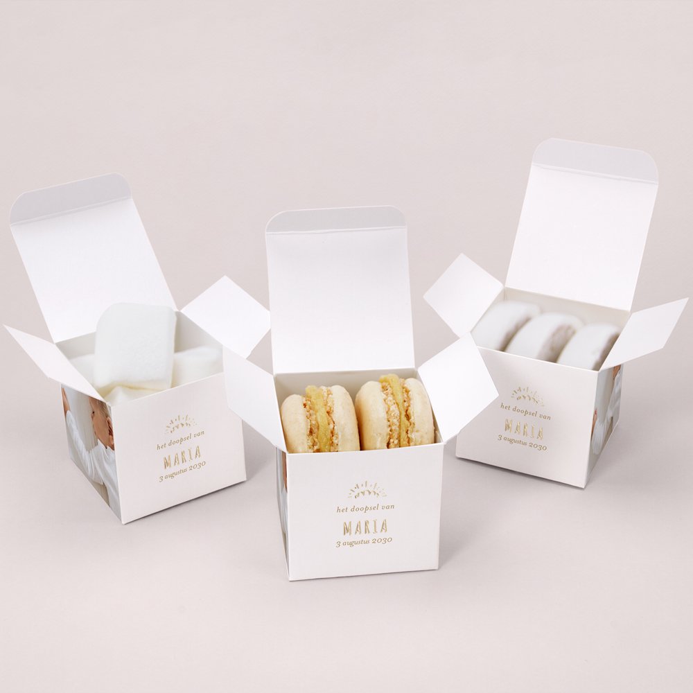 Een verrassingsdoosje als cadeautje voor je familie en vrienden, een mooie herinnering aan het doopfeest van jullie kind. Een kleine kubus van 5,4 x 5,4 cm waarin verschillende soorten lekkernijen kunnen. Laat je creativiteit de vrije loop!