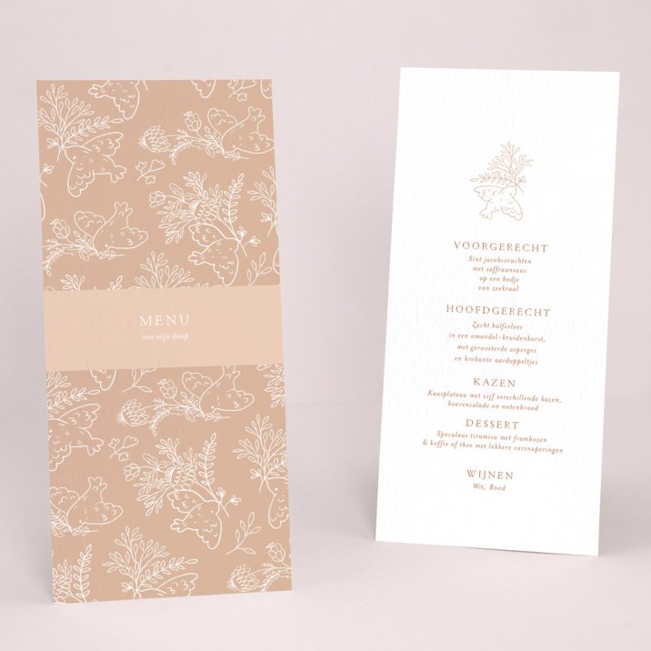 Wat staat er op het menu tijdens deze heugelijke dag van samenzijn? Laat je gasten watertanden door het aankondigen van het eetfestijn op mooie menukaarten. De menukaaren zijn natuurlijk in dezelfde stijl als de uitnodigingen van het doop, communie of lentefeest.