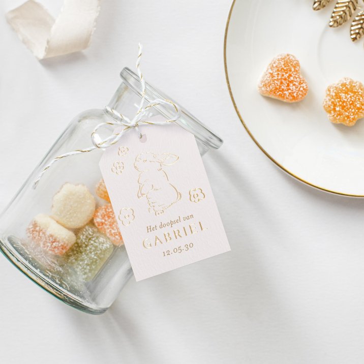 Deze cadeaulabels zijn ideaal voor het afwerken van originele bedankjes voor de doop van je kindje. Dankzij de perforatie kan je er moeiteloos een lintje doorrijgen en bevestigen aan een snoepdoosje of ander klein cadeautje. (lintje optioneel naar keuze)