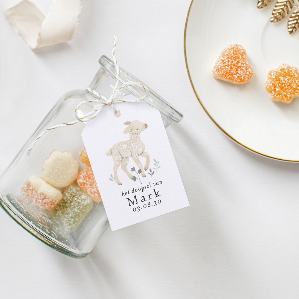 Deze cadeaulabels zijn ideaal voor het afwerken van originele bedankjes voor de doop van je kindje. Dankzij de perforatie kan je er moeiteloos een lintje doorrijgen en bevestigen aan een snoepdoosje of ander klein cadeautje. (lintje optioneel naar keuze)