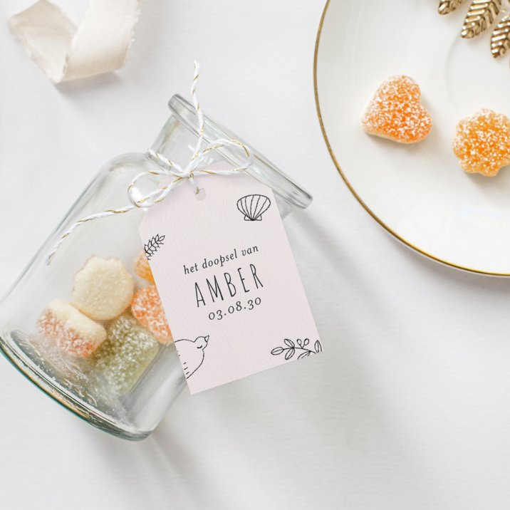 Deze cadeaulabels zijn ideaal voor het afwerken van originele bedankjes voor de doop van je kindje. Dankzij de perforatie kan je er moeiteloos een lintje doorrijgen en bevestigen aan een snoepdoosje of ander klein cadeautje. (lintje optioneel naar keuze)