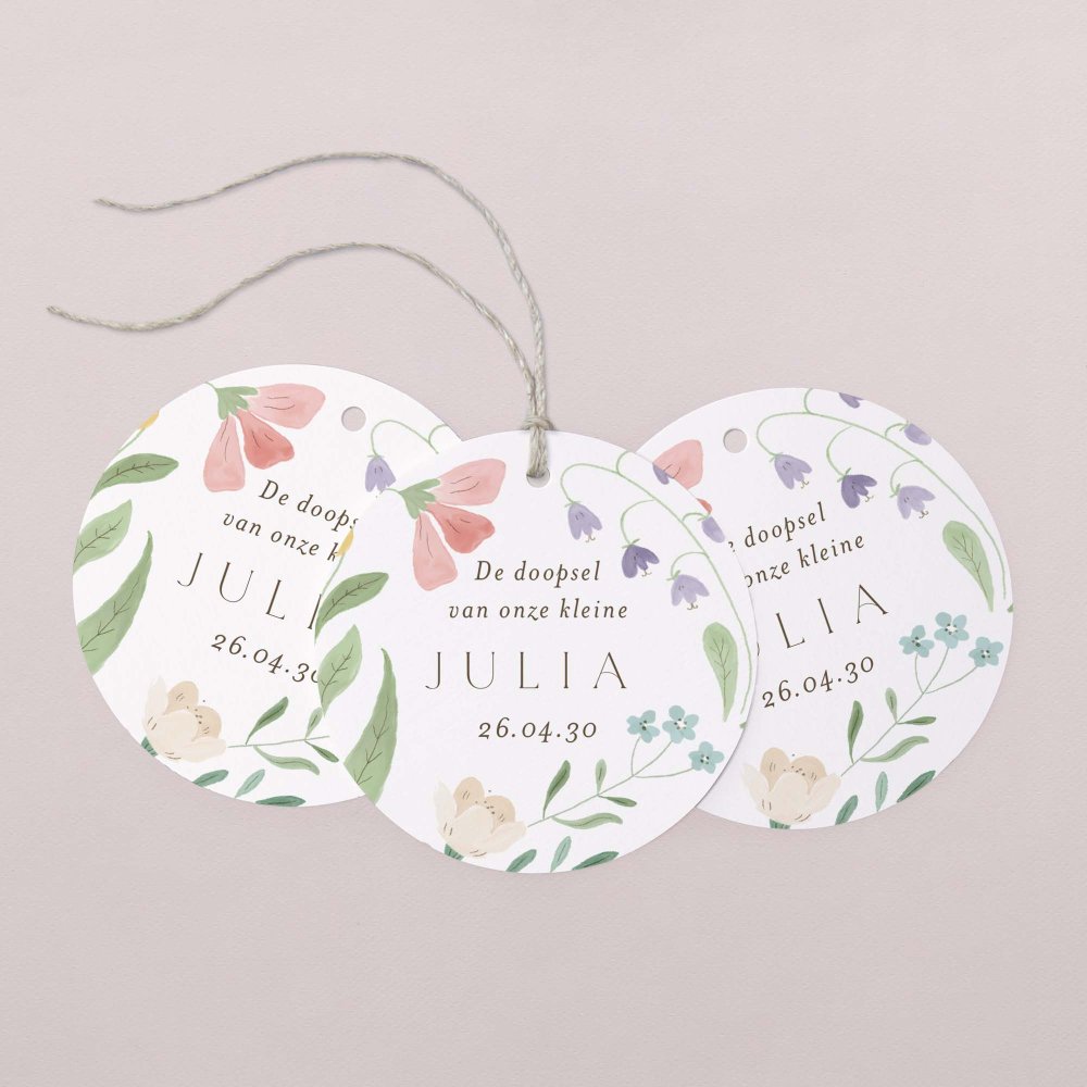 Deze ronde cadeaulabels zijn ideaal voor het afwerken van originele bedankjes voor de doop van je kindje. Dankzij de perforatie kan je er moeiteloos een lintje doorrijgen en bevestigen aan een snoepdoosje of ander klein cadeautje. (lintje optioneel naar keuze)