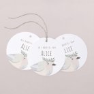 Deze ronde cadeaulabels zijn ideaal voor het afwerken van originele bedankjes voor de doop van je kindje. Dankzij de perforatie kan je er moeiteloos een lintje doorrijgen en bevestigen aan een snoepdoosje of ander klein cadeautje. (lintje optioneel naar keuze)