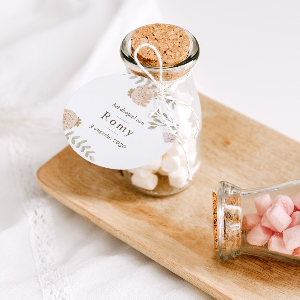 Deze ronde cadeaulabels zijn ideaal voor het afwerken van originele bedankjes voor de doop van je kindje. Dankzij de perforatie kan je er moeiteloos een lintje doorrijgen en bevestigen aan een snoepdoosje of ander klein cadeautje. (lintje optioneel naar keuze)