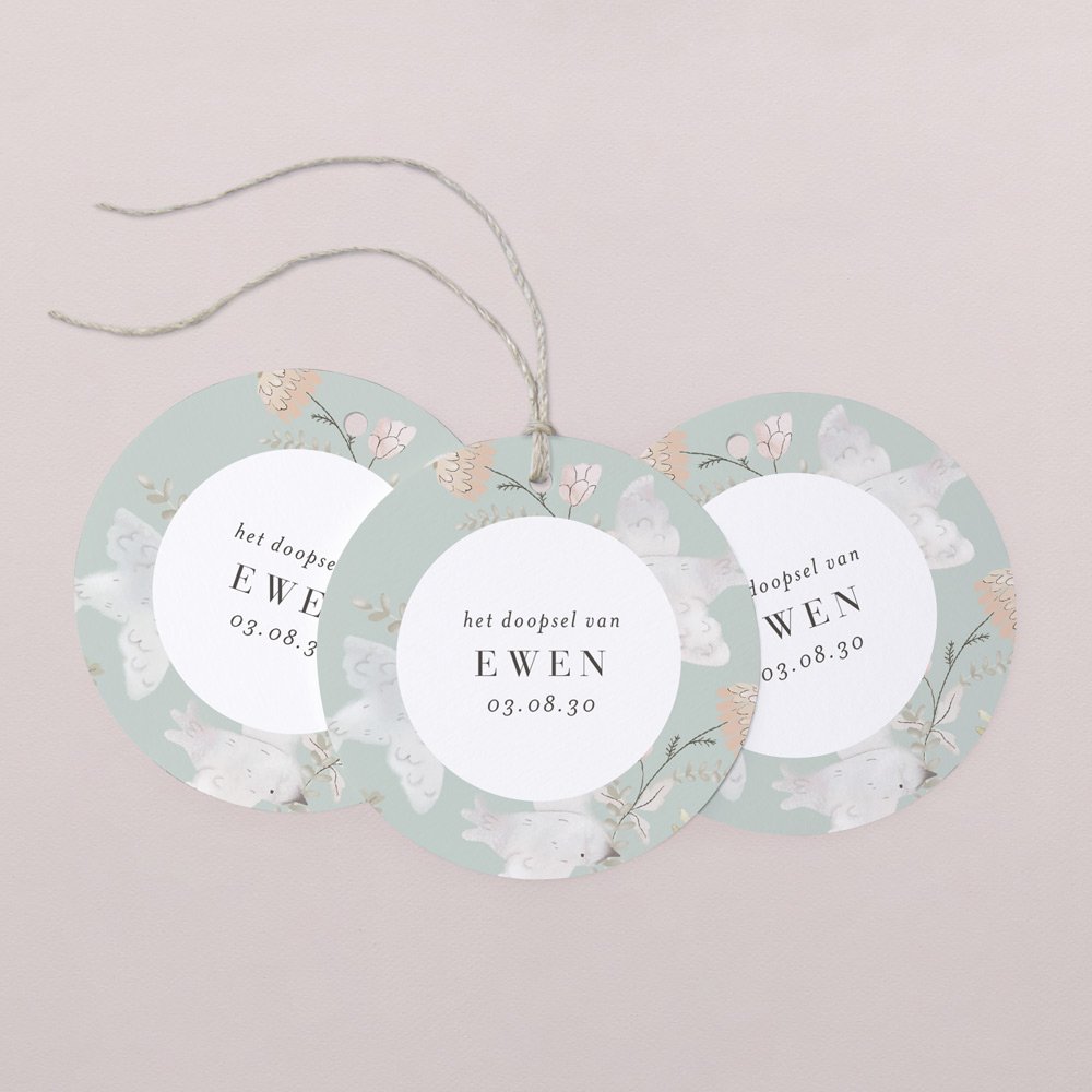 Deze ronde cadeaulabels zijn ideaal voor het afwerken van originele bedankjes voor de doop van je kindje. Dankzij de perforatie kan je er moeiteloos een lintje doorrijgen en bevestigen aan een snoepdoosje of ander klein cadeautje. (lintje optioneel naar keuze)