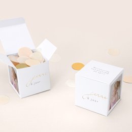 De uitnodigingskaart Signature lijkt op een polaroid met goudkleurige letters en zal de foto van je dropje, dat op het punt staat zijn of haar verjaardag te vieren, wonderbaarlijk mooi naar voren laten komen.