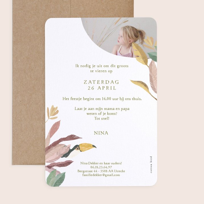 Met zijn weelderige gebladerte en rijk contrasterend kleurenpalet is de Mowgli-uitnodiging een geweldige manier om de jungle-chique verjaardag van je kind aan te kondigen.