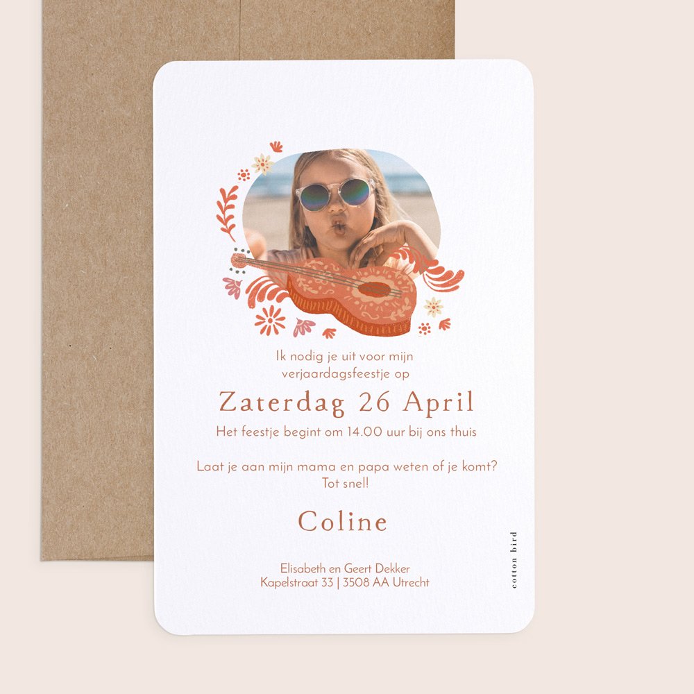 De mascotte van onze Mexico-kaart, een majestueuze lama, leidt een feestelijke optocht voor de uitnodiging voor het verjaardagsfeestje van je kind. Zuid-Amerikaans geïnspireerde ornamenten in pittige kleuren maken het plaatje compleet voor een warme en exotische uitnodiging.