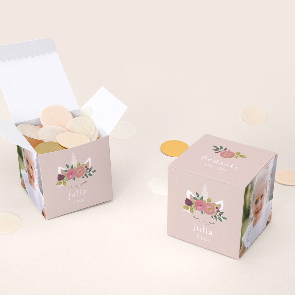 Zorg ervoor dat de gasten vertrekken met een leuk aandenken aan de verjaardag van je kind door hen een klein verrassingsdoosje te geven van het design Eenhoorn.