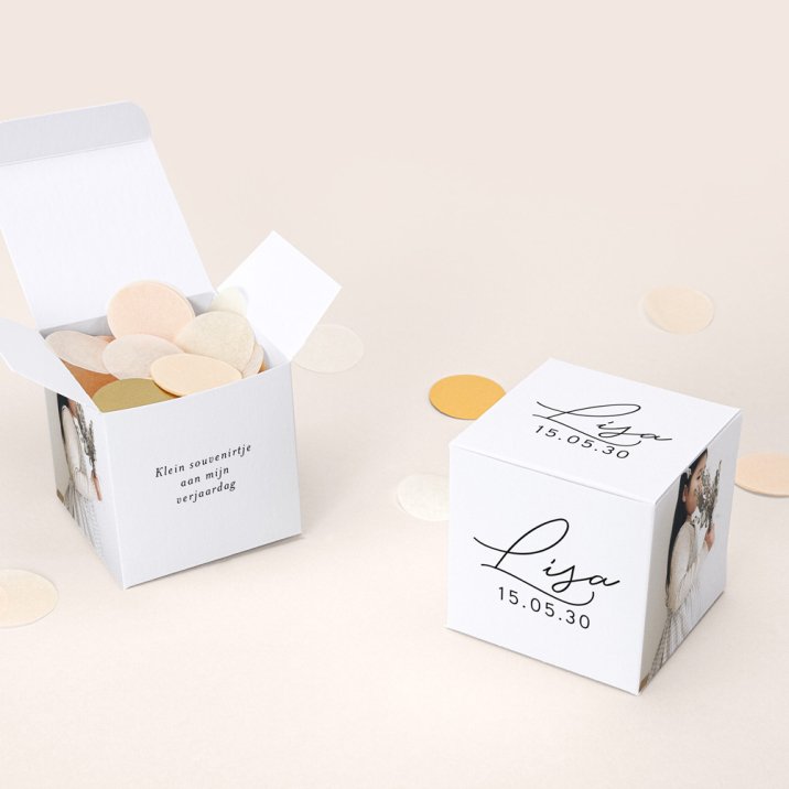 Het verrassingsdoosje is speciaal ontworpen en gemaakt om jullie mini gasten te te verrassen met een smakelijk traktatie! Personaliseer het doosje met een lief berichtje, foto of naam van je kind. Kies voor heerlijke suikerbonen (optioneel verkrijgbaar), ambachtelijk gemaakt in het zuiden van Frankrijk. Wij raden aan om 20 suikerbonen per doos toe te voegen (50 g).