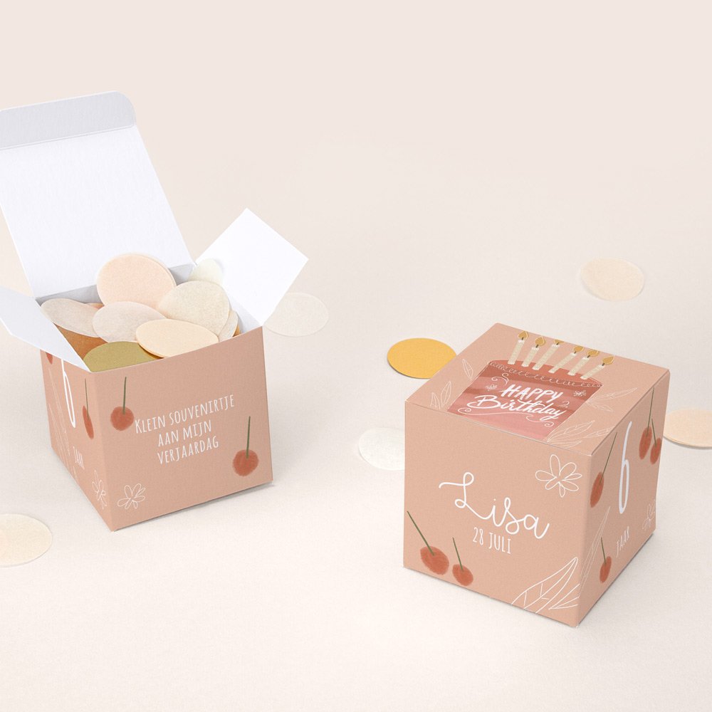 Zorg ervoor dat de gasten vertrekken met een leuk aandenken aan de verjaardag van je kind door hen een klein verrassingsdoosje te geven van het design Cherrycake.