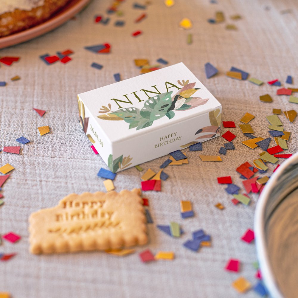 Het koekjesdoosje is speciaal ontworpen en gemaakt om jullie mini gasten te te verrassen met een smakelijk traktatie! Personaliseer het doosje met een lief berichtje, foto of naam van je kind. In 1 doosje kunnen 3 of 4 koekjes, afhangend van de dikte van het koekje.Vind hier het recept voor de koekjes, door onze chef Isa!