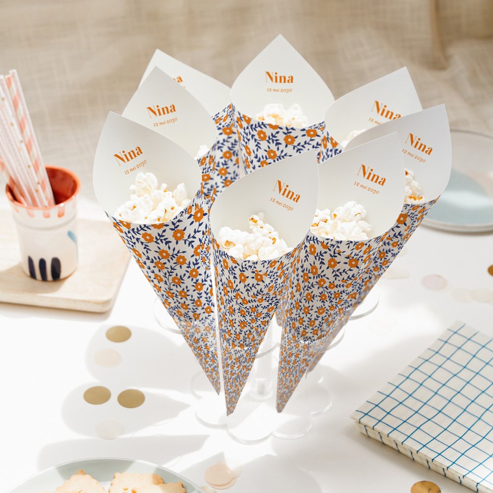 Confetti, bollen voor blaaspijp en feestartikelen voor een vrolijke sfeer, kleurpotloden voor een creatieve workshop, snoepjes (popcorns, marshmallows ...), minitraktaties ... er zijn veel mogelijkheden om je snoephoorntjes in te zetten tijdens het verjaardagsfeestje.