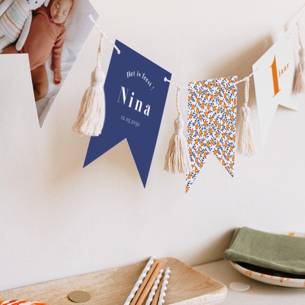 Deze slinger van 16 dubbelzijdige wimpels, passend bij de uitnodigingskaart die je hebt gekozen, is te personaliseren met de naam van je kind, de datum van zijn/haar verjaardag, foto en een eigen tekst.