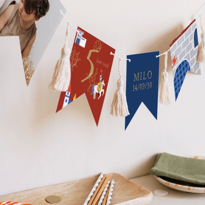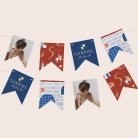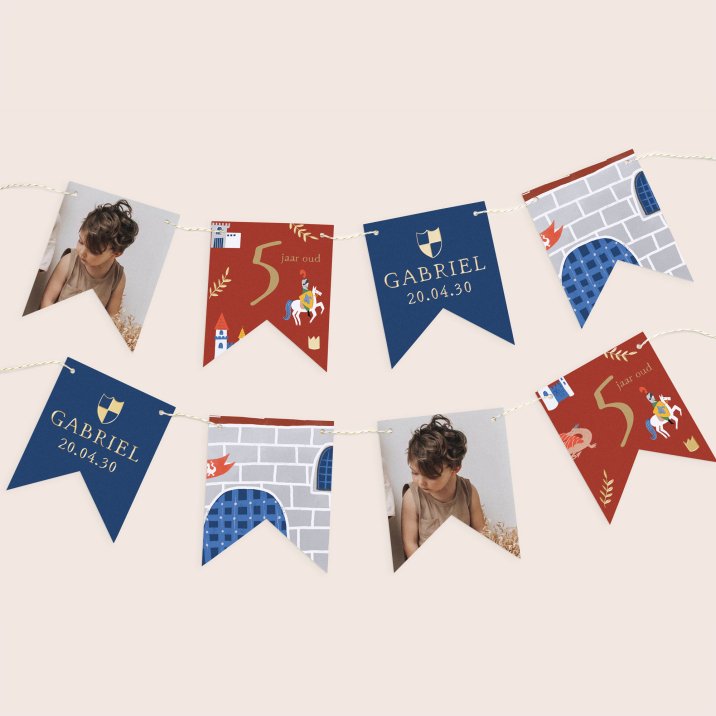 Deze slinger van 16 dubbelzijdige wimpels, passend bij de uitnodigingskaart die je hebt gekozen, is te personaliseren met de naam van je kind, de datum van zijn/haar verjaardag, foto en een eigen tekst.