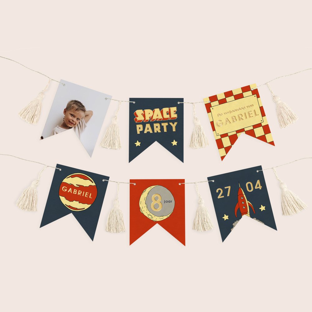 Deze slinger van 16 dubbelzijdige wimpels, passend bij de uitnodigingskaart die je hebt gekozen, is te personaliseren met de naam van je kind, de datum van zijn/haar verjaardag, foto en een eigen tekst.