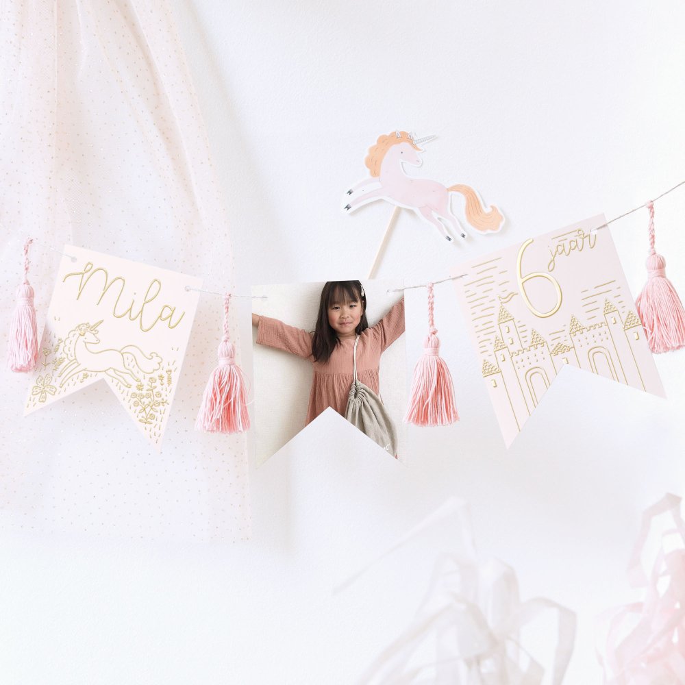 Deze slinger van 16 dubbelzijdige wimpels, passend bij de uitnodigingskaart die je hebt gekozen, is te personaliseren met de naam van je kind, de datum van zijn/haar verjaardag, foto en een eigen tekst.