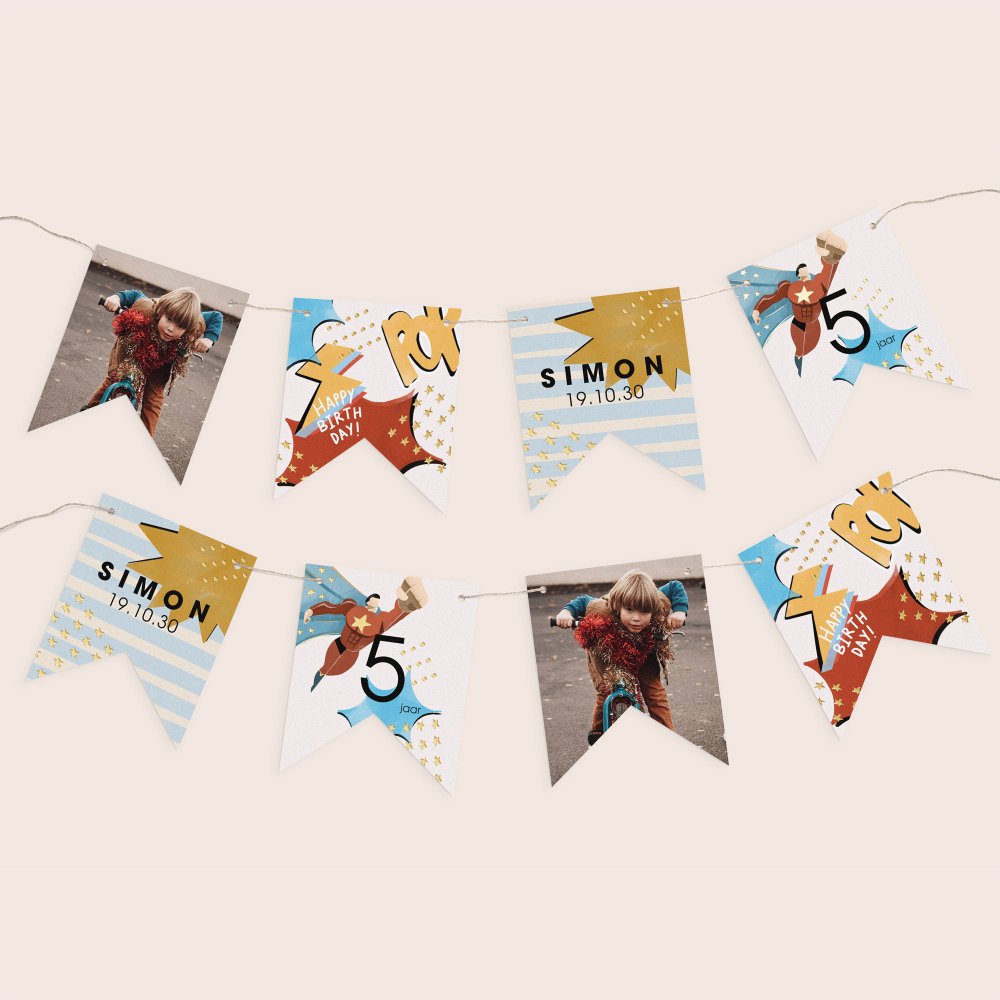 Deze slinger van 16 dubbelzijdige wimpels, passend bij de uitnodigingskaart die je hebt gekozen, is te personaliseren met de naam van je kind, de datum van zijn/haar verjaardag, foto en een eigen tekst.