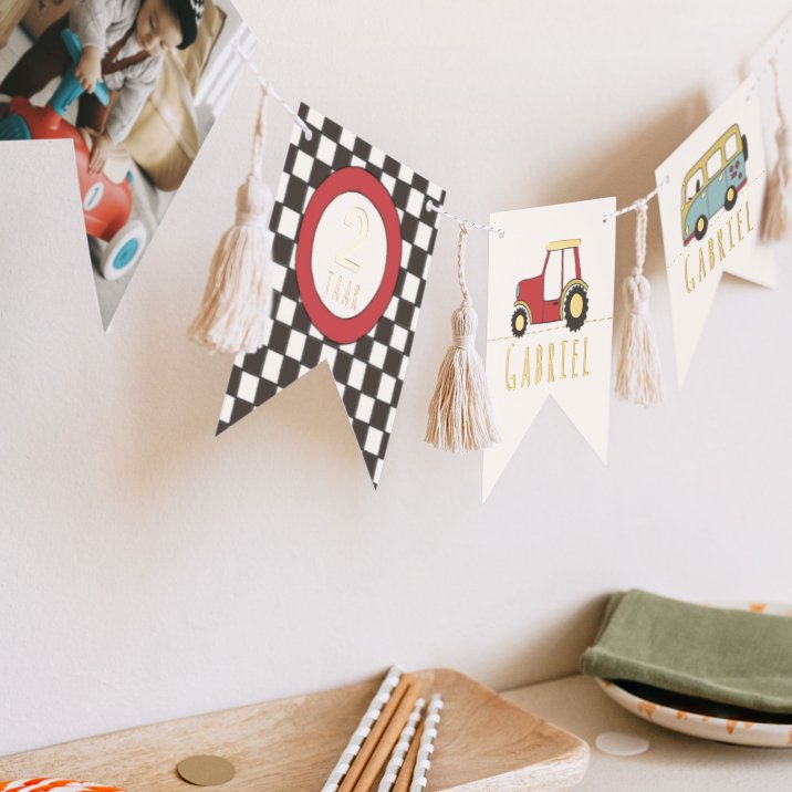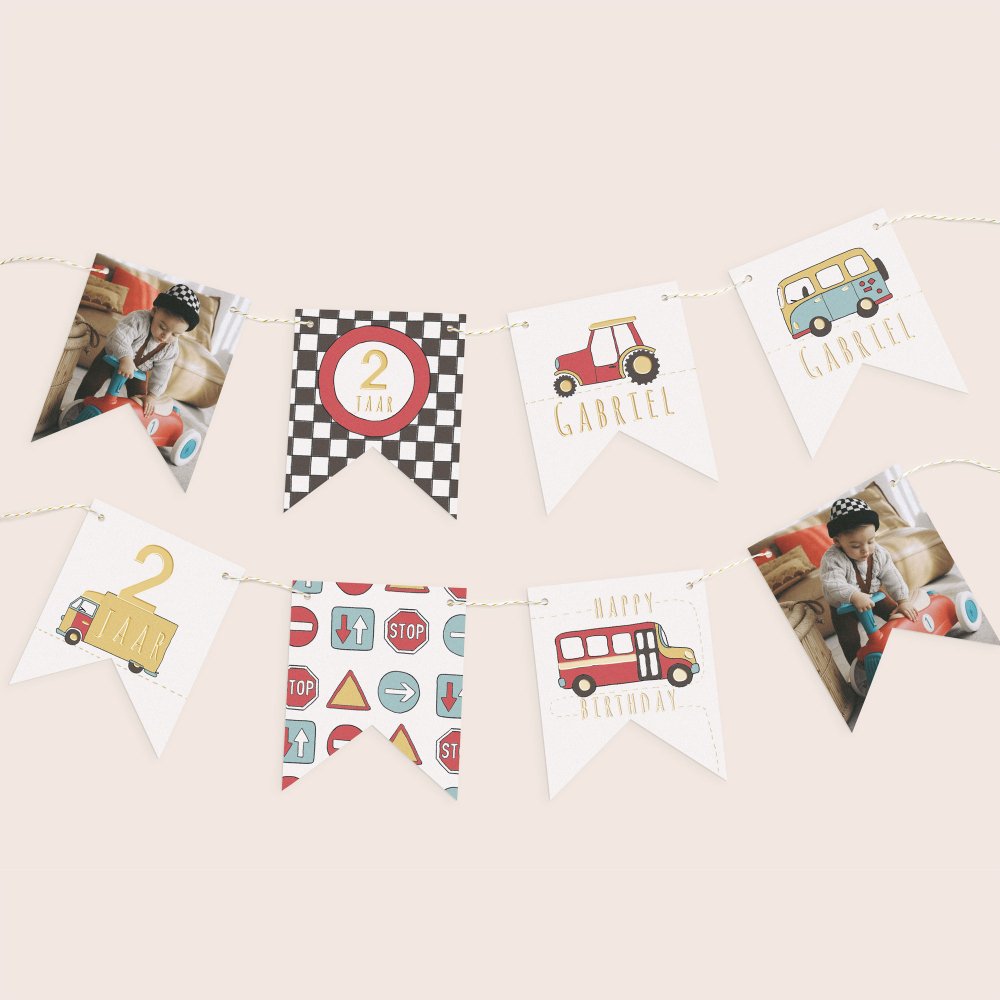 Deze slinger van 16 dubbelzijdige wimpels, passend bij de uitnodigingskaart die je hebt gekozen, is te personaliseren met de naam van je kind, de datum van zijn/haar verjaardag, foto en een eigen tekst.