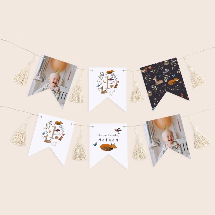 Deze slinger van 16 dubbelzijdige wimpels, passend bij de uitnodigingskaart die je hebt gekozen, is te personaliseren met de naam van je kind, de datum van zijn/haar verjaardag, foto en een eigen tekst.