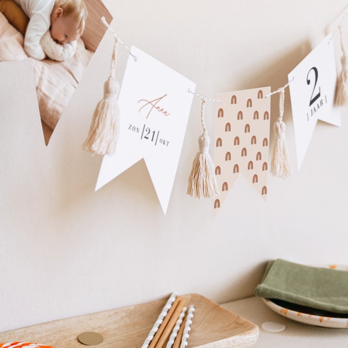 Deze slinger van 16 dubbelzijdige wimpels, passend bij de uitnodigingskaart die je hebt gekozen, is te personaliseren met de naam van je kind, de datum van zijn/haar verjaardag, foto en een eigen tekst.