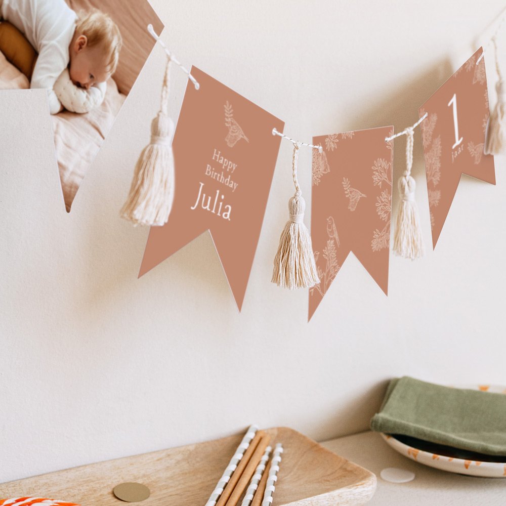 Deze slinger van 16 dubbelzijdige wimpels, passend bij de uitnodigingskaart die je hebt gekozen, is te personaliseren met de naam van je kind, de datum van zijn/haar verjaardag, foto en een eigen tekst.