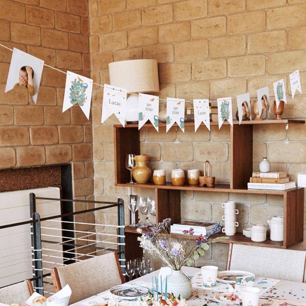 Deze slinger van 16 dubbelzijdige wimpels, passend bij de uitnodigingskaart die je hebt gekozen, is te personaliseren met de naam van je kind, de datum van zijn/haar verjaardag, foto en een eigen tekst.