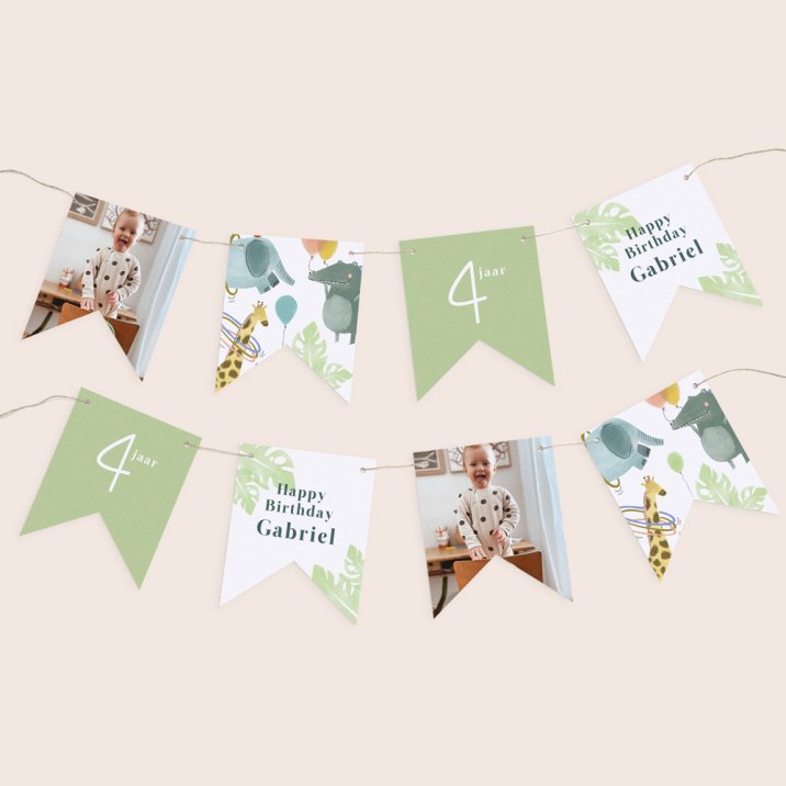 Deze slinger van 16 dubbelzijdige wimpels, passend bij de uitnodigingskaart die je hebt gekozen, is te personaliseren met de naam van je kind, de datum van zijn/haar verjaardag, foto en een eigen tekst.