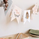 Deze slinger van 16 dubbelzijdige wimpels, passend bij de uitnodigingskaart die je hebt gekozen, is te personaliseren met de naam van je kind, de datum van zijn/haar verjaardag, foto en een eigen tekst.