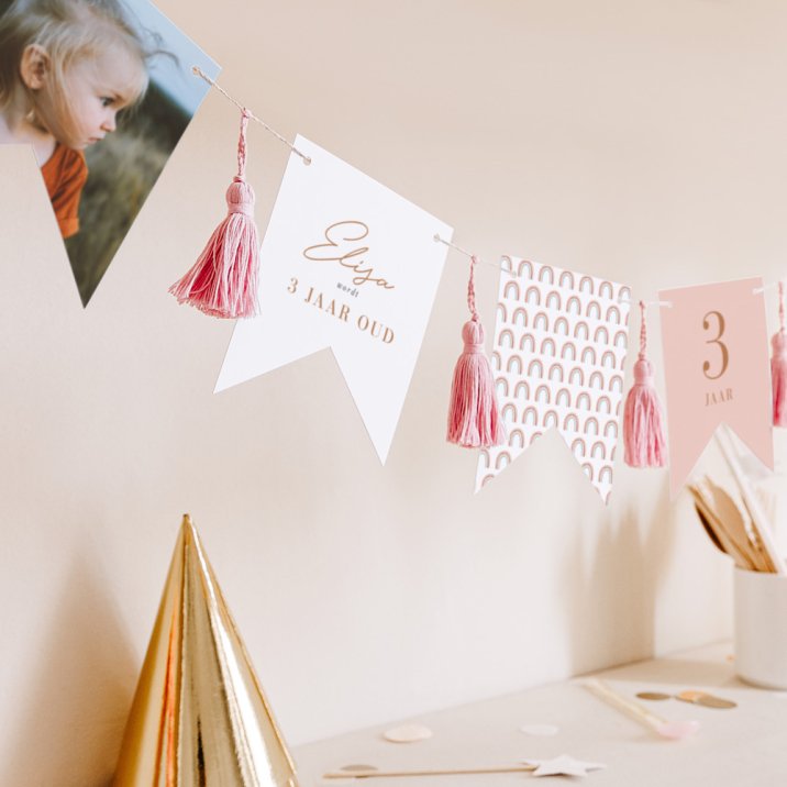 Deze slinger van 16 dubbelzijdige wimpels, passend bij de uitnodigingskaart die je hebt gekozen, is te personaliseren met de naam van je kind, de datum van zijn/haar verjaardag, foto en een eigen tekst.