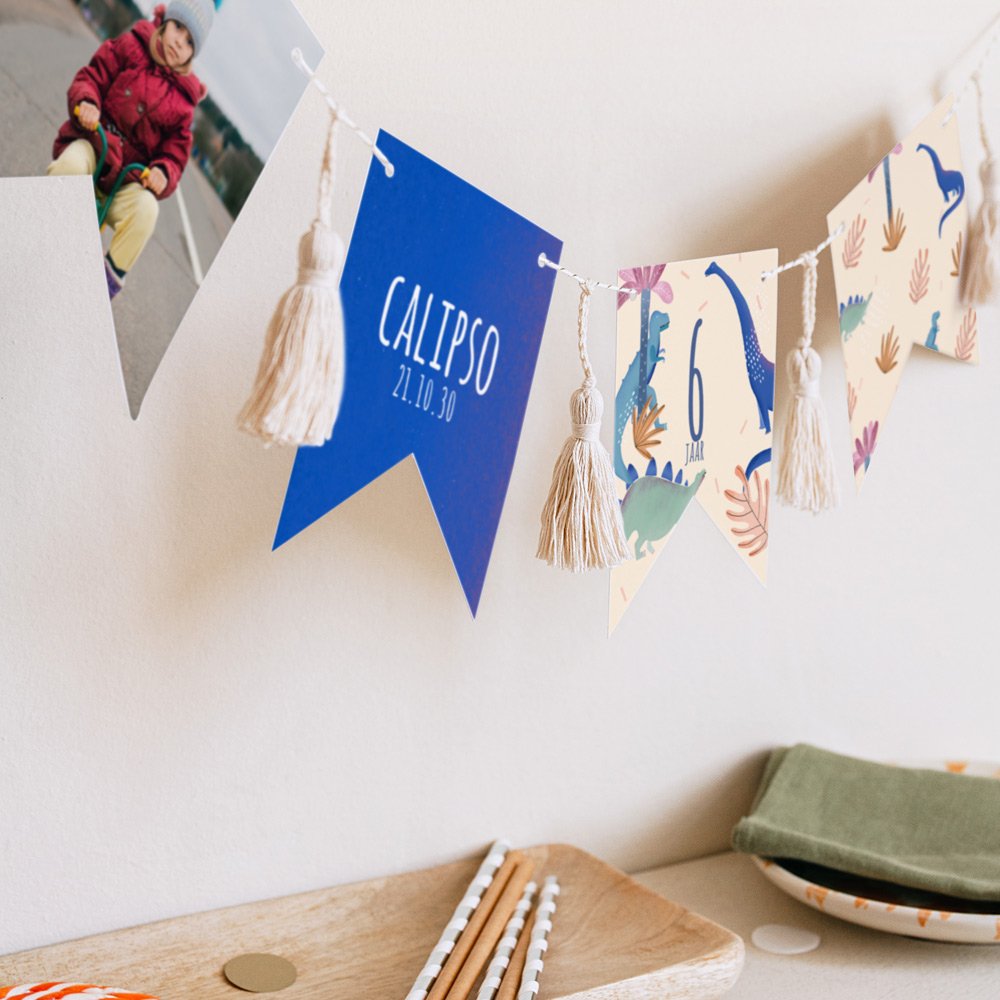 Deze slinger van 16 dubbelzijdige wimpels, passend bij de uitnodigingskaart die je hebt gekozen, is te personaliseren met de naam van je kind, de datum van zijn/haar verjaardag, foto en een eigen tekst.