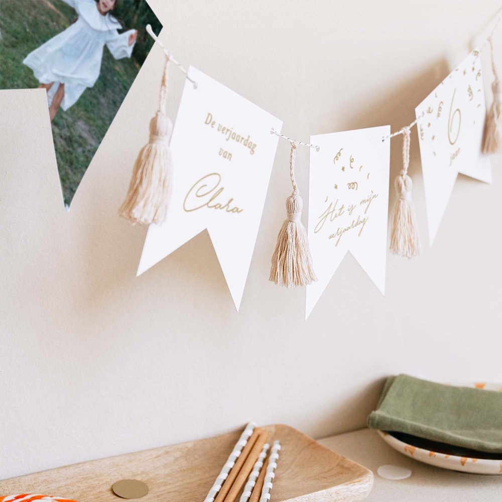 Deze slinger van 16 dubbelzijdige wimpels, passend bij de uitnodigingskaart die je hebt gekozen, is te personaliseren met de naam van je kind, de datum van zijn/haar verjaardag, foto en een eigen tekst.
