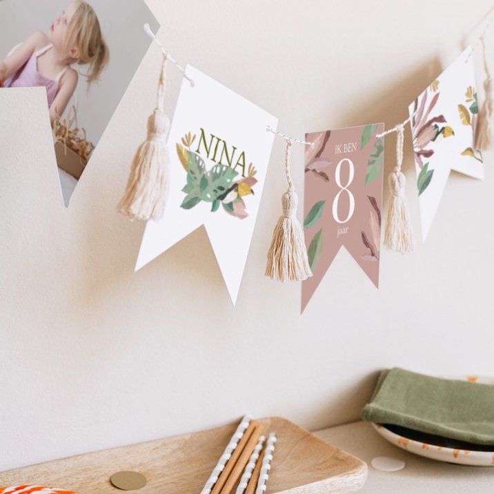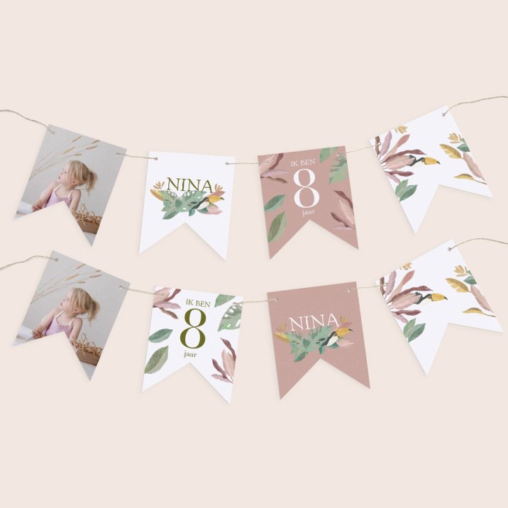 Deze slinger van 16 dubbelzijdige wimpels, passend bij de uitnodigingskaart die je hebt gekozen, is te personaliseren met de naam van je kind, de datum van zijn/haar verjaardag, foto en een eigen tekst.