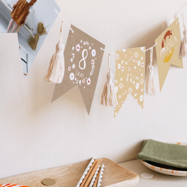 Deze slinger van 16 dubbelzijdige wimpels, passend bij de uitnodigingskaart die je hebt gekozen, is te personaliseren met de naam van je kind, de datum van zijn/haar verjaardag, foto en een eigen tekst.