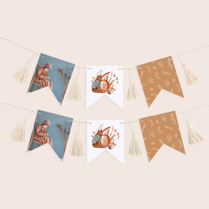 Deze slinger van 16 dubbelzijdige wimpels, passend bij de uitnodigingskaart die je hebt gekozen, is te personaliseren met de naam van je kind, de datum van zijn/haar verjaardag, foto en een eigen tekst.