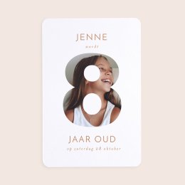 Deze slinger van 16 dubbelzijdige wimpels, passend bij de uitnodigingskaart die je hebt gekozen, is te personaliseren met de naam van je kind, de datum van zijn/haar verjaardag, foto en een eigen tekst.