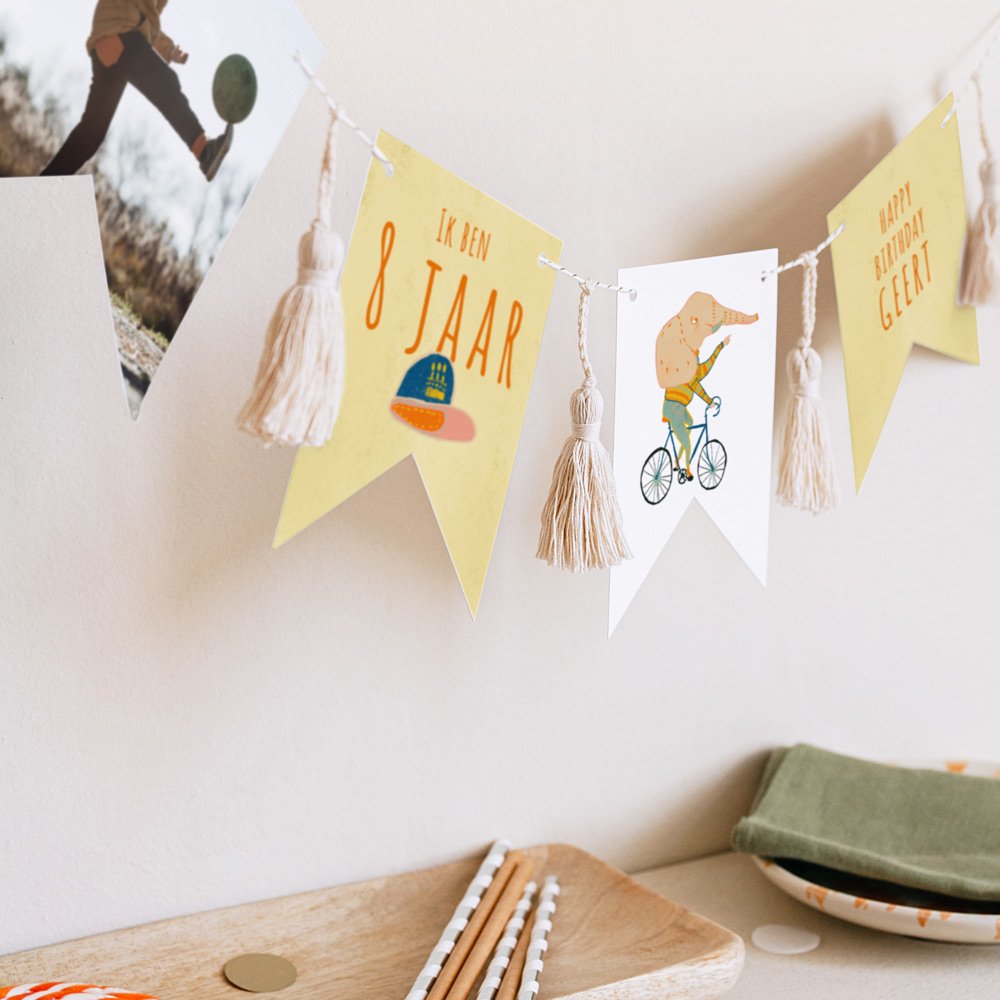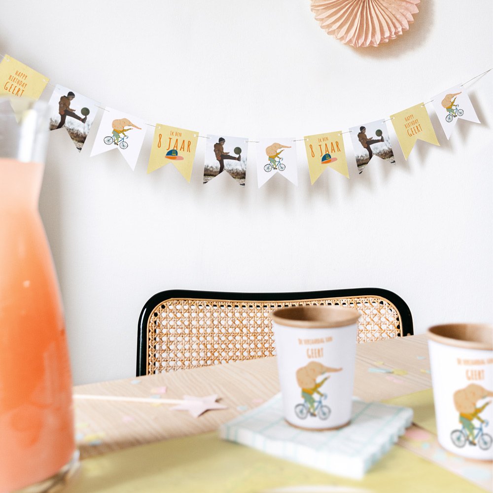 Deze slinger van 16 dubbelzijdige wimpels, passend bij de uitnodigingskaart die je hebt gekozen, is te personaliseren met de naam van je kind, de datum van zijn/haar verjaardag, foto en een eigen tekst.