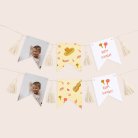 Deze slinger van 16 dubbelzijdige wimpels, passend bij de uitnodigingskaart die je hebt gekozen, is te personaliseren met de naam van je kind, de datum van zijn/haar verjaardag, foto en een eigen tekst.