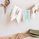 Deze slinger van 16 dubbelzijdige wimpels, passend bij de uitnodigingskaart die je hebt gekozen, is te personaliseren met de naam van je kind, de datum van zijn/haar verjaardag, foto en een eigen tekst.