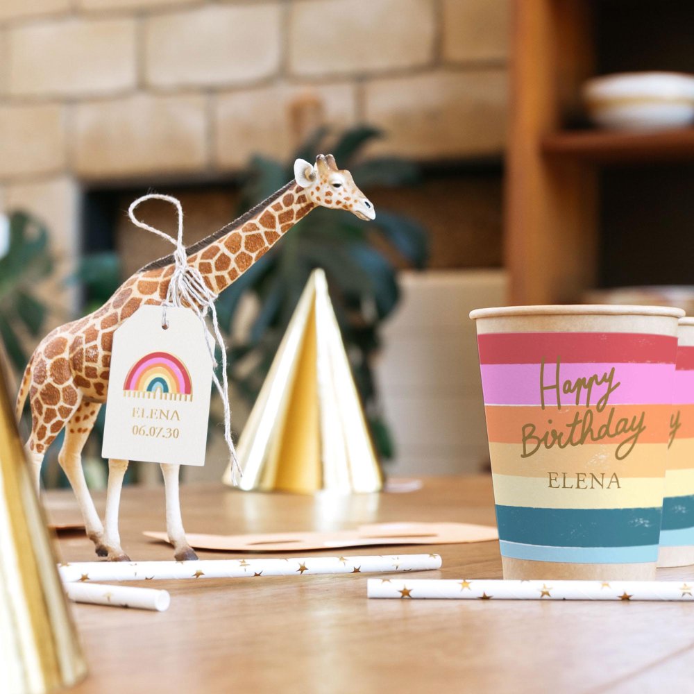 Dit label, passend bij de uitnodigingskaart van je kind, zal een feestelijke noot toevoegen aan al je traktatie-ideeën.