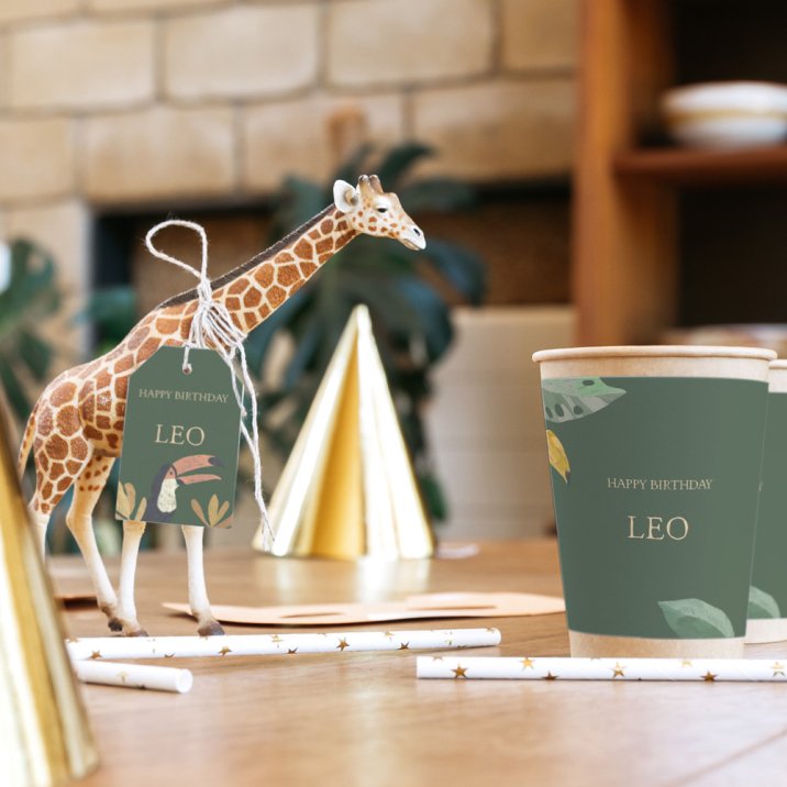 Personaliseer de zakjes met snoep en andere lekkernijen voor de gasten met een label van het design Jungle party.