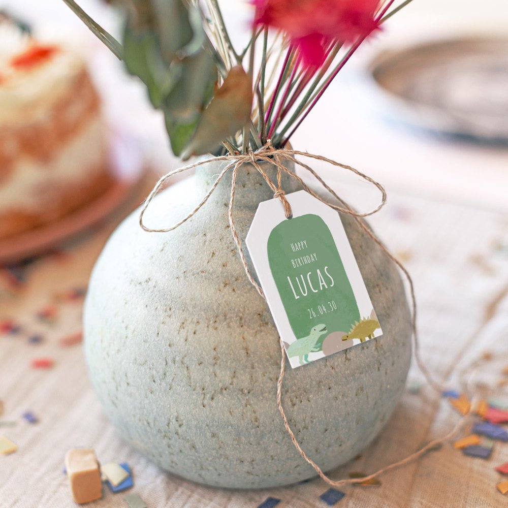 Dit label, passend bij de uitnodigingskaart van je kind, zal een feestelijke noot toevoegen aan al je traktatie-ideeën.