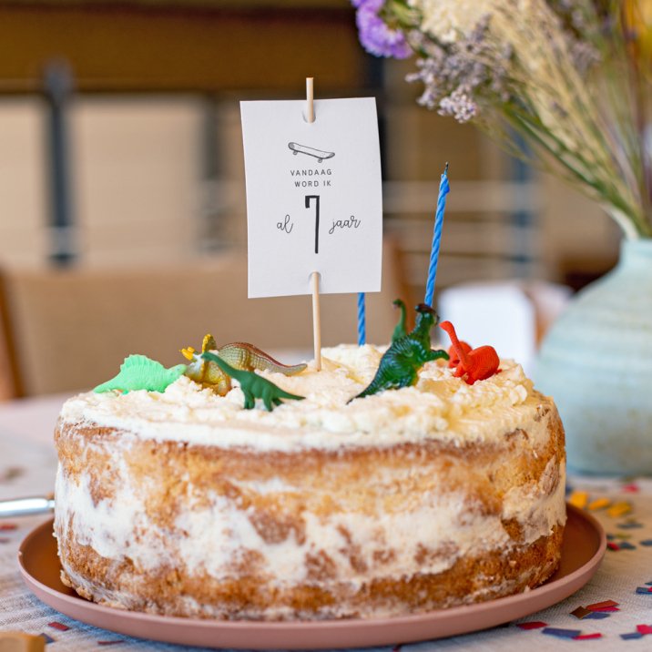 Kies de taarttopper in dezelfde stijl als de verjaardagsuitnodiging. De topper is personaliseerbaar, zowel op de voor- als achterkant. Voeg bijvoorbeeld de naam van je kind en de datum van het kinderfeestje toe. Versier de verjaardagstaart of andere lekkernijen zoals muffins en cupcakes en verras je kind en zijn/haar mini gasten!