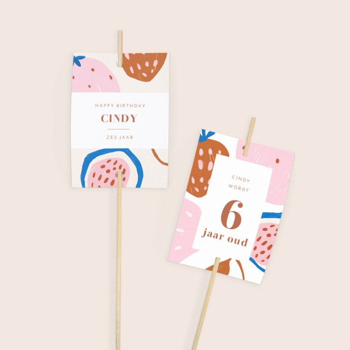 Kies de taarttopper in dezelfde stijl als de verjaardagsuitnodiging. De topper is personaliseerbaar, zowel op de voor- als achterkant. Voeg bijvoorbeeld de naam van je kind en de datum van het kinderfeestje toe. Versier de verjaardagstaart of andere lekkernijen zoals muffins en cupcakes en verras je kind en zijn/haar mini gasten!