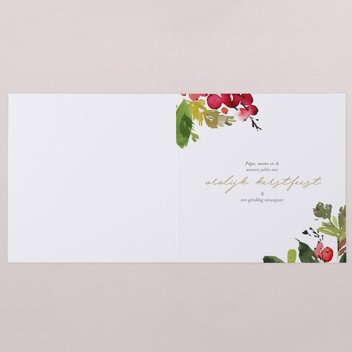 Deze kerstkaart is een dubbele kaart met een vouwlijn door het midden. Je persoonlijke bericht komt in de binnenkant van de kaart.