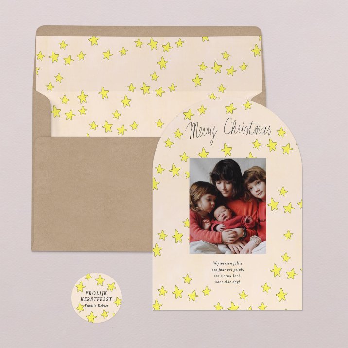 Deze kerstkaart wordt gekenmerkt door zijn afgeronde bovenranden in de vorm van een boog en kan aan de voor- en achterkant worden gepersonaliseerd met je allerbeste wensen.