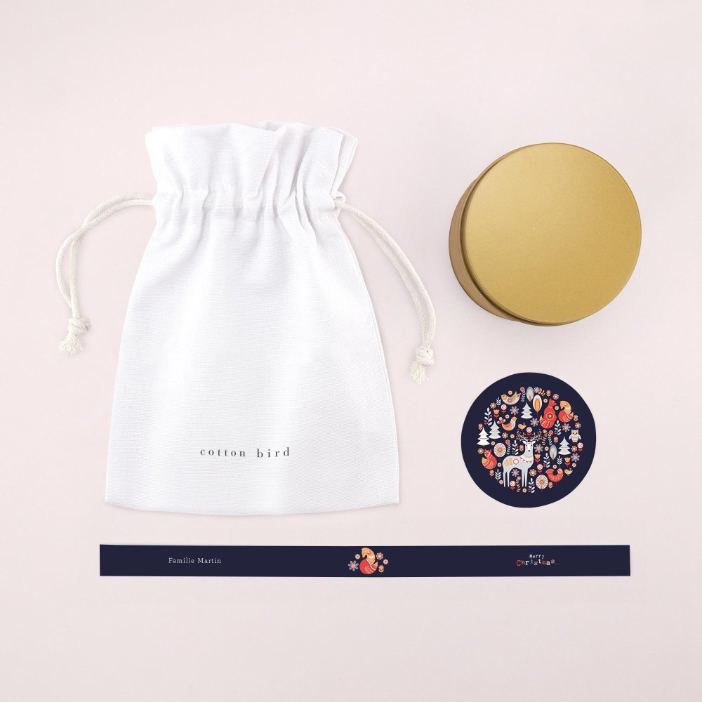 De geurkaarsen worden bezorgd in een katoenen hoesje, samen met twee labeltjes die je zelf kan opmaken en bevestigen op de geurkaars.