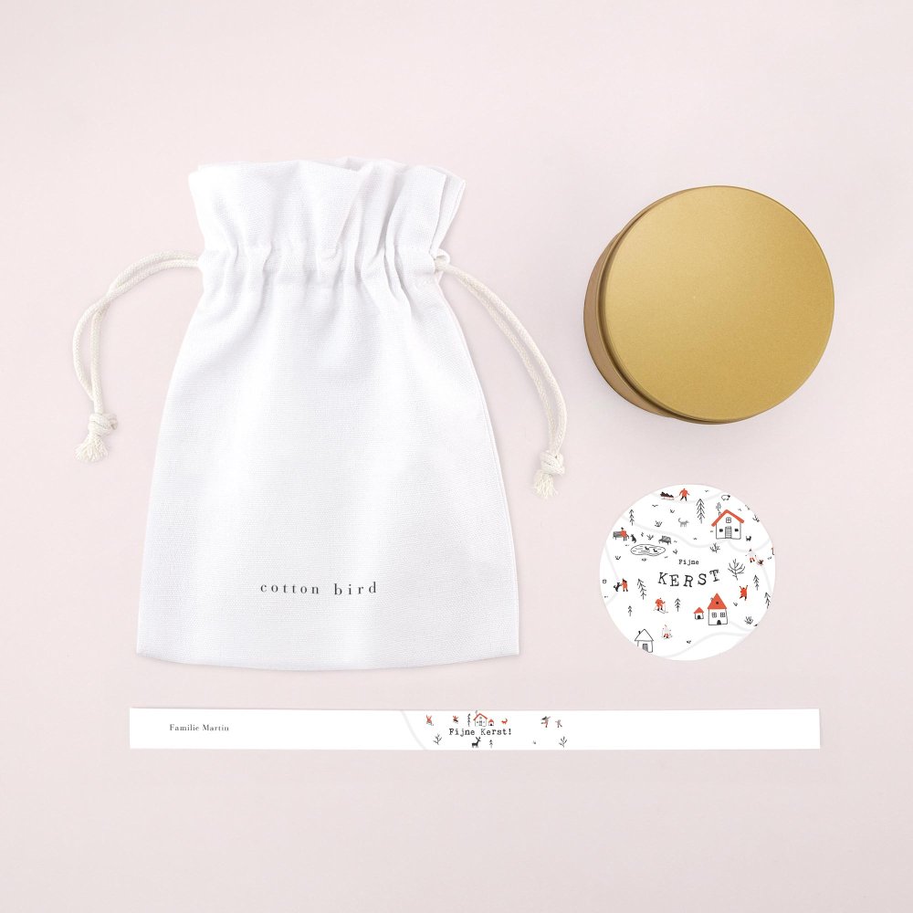 De geurkaarsen worden bezorgd in een katoenen hoesje, samen met twee labeltjes die je zelf kan opmaken en bevestigen op de geurkaars.